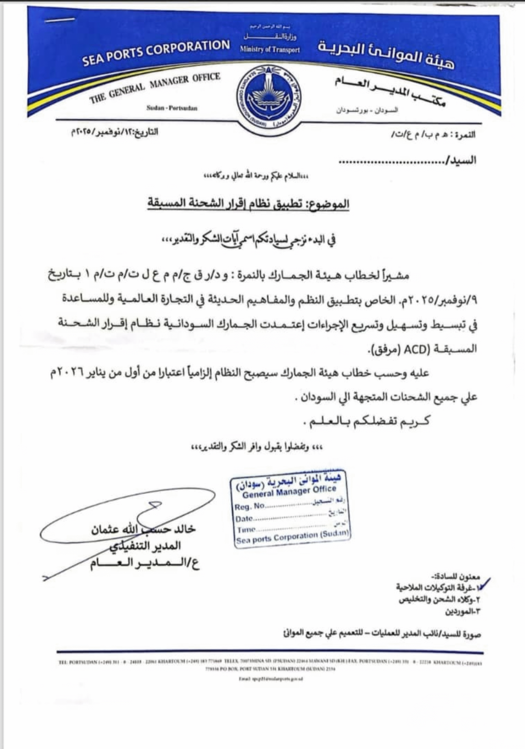The Sudan Customs Authority has issued an official communication dated 9 November 2025) announcing the national rollout of the Advance Cargo Declaration (ACD) system which will require all shipments to Sudan to comply with the ACD requirement starting 1 January 2026.